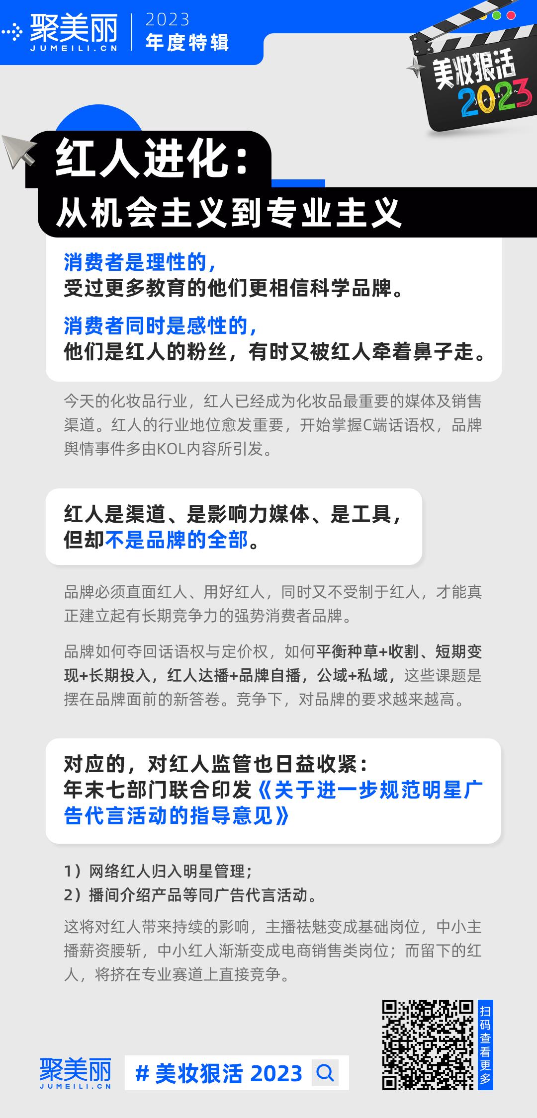 2023年,将是中国化妆品行业范式更迭和模式切换的关键年份。科学与研发将成为行业主流,品牌们从追求GMV扩张到谋求高质量增长;红人经历了机会主义内卷,最终胜出的将是专业主义者;在消费者与新法规的多重作用下,化妆品行业将完成新旧周期转换。