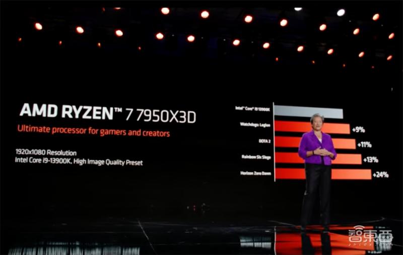 这次根据苏妈亮出的PPT,顶级Ryzen 9 7950X3D的游戏性能,相比英特尔最新的旗舰处理器i9-13900K,有着最高24%的领先,领先幅度还是相当大的。不过这只是理论,实际表现我们还要等待后续实测。