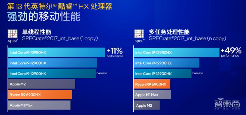 其中酷睿i9-13980HX成为了笔记本电脑中首款具有24核心的移动处理器,并且单核最高睿频直接冲上了5.6GHz,相比12代HK系列产品,其单线程性能提升11%,多线程性能提升达到了49%。