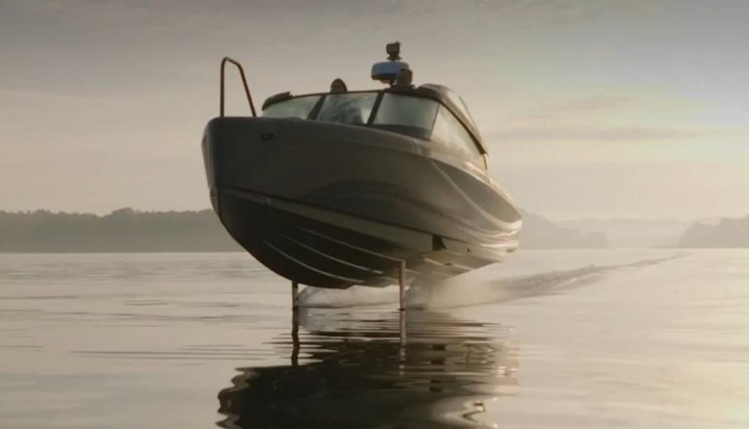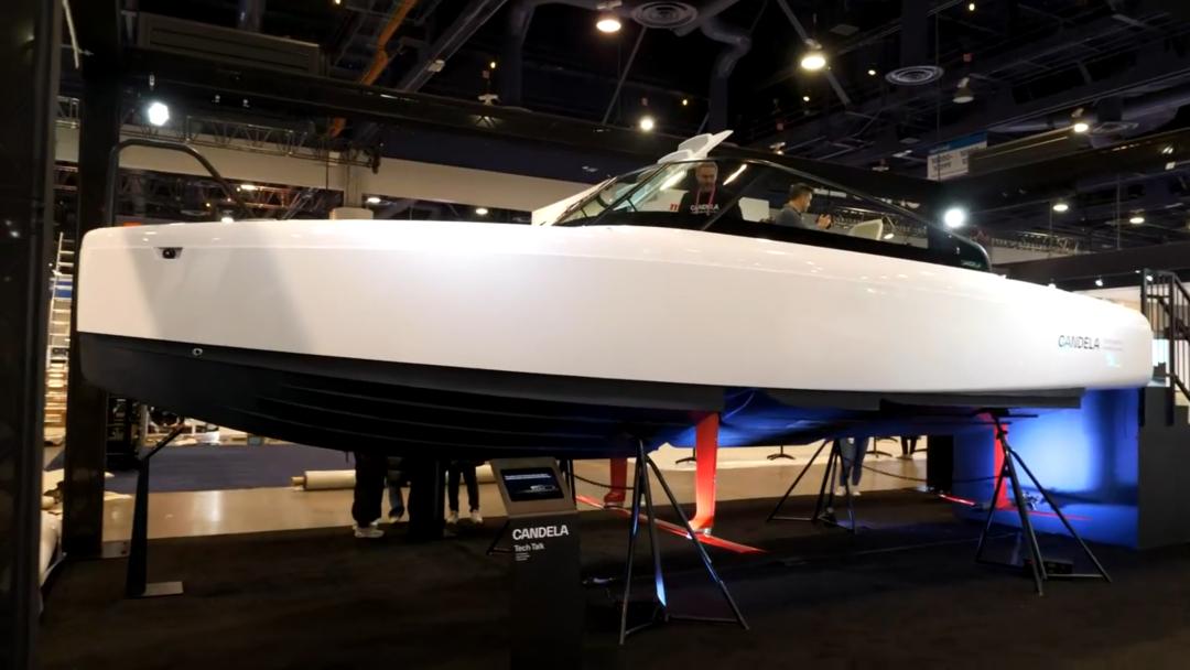 除了汽车,别忘了船。瑞典科技公司Candela这次展出了最新的Candela C8电动水翼船,正如它的名字一样,这是一款可以“在水上飞”的船,Candela C8在水上行进时,只有动力系统会位于水中,船身整体是悬浮于水面上的。