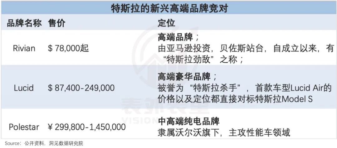 高端市场领域,也是一样的情况。如下图,近几年,市场涌现出了Rivian、Lucid、Polestar等众多高价品牌。