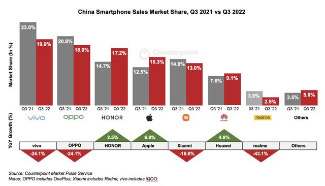 中国市场智能手机销量份额,2021年Q3对比2022年Q3 / 图片来源:Counterpoint Research 手机销量月度报告