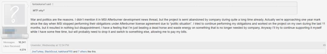 此言一出,国内外许多网友为此感到惋惜,还有一些网友表示愿意捐款给作者,希望作者振作起来,能够为为MSI Afterburner提供后续更新维护。还好,微星及时回应,并没有放弃MSI Afterburner,正在积极给对方打款。