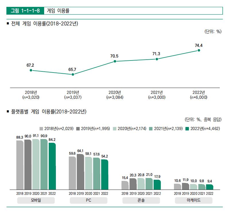 一些调查数据或许能更为直观地证明这一点:根据韩国文化产业振兴院发布的《2022年韩国游戏白皮书》,在6000名年龄在10-65岁的调查对象中,有74.4%为游戏玩家;而Newzoo则在报道中提到,韩国玩家中的付费人数占比达到了85%,这也将整个游戏市场的产值大盘“撑”了起来。