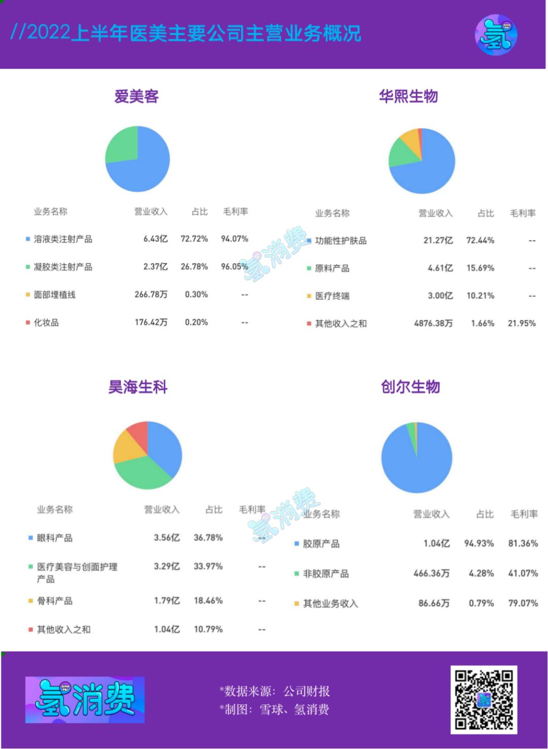 而昊海生科2022年上半年公司营业收入约9.679亿元,按产品分类,眼科产品收入占比为36.78%,约为3.560亿元;医疗美容与创面护理产品收入占比33.97%,约为3.287亿元。