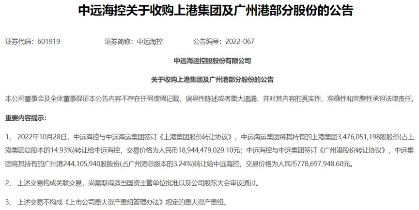 10月28日,中远海控发公告称,用189.44亿收购中远海运集团持有的上港集团14.93%股份,以及用7.78亿收购中远集团持有的广州港3.24%股份,两笔交易金额合计197.22亿。