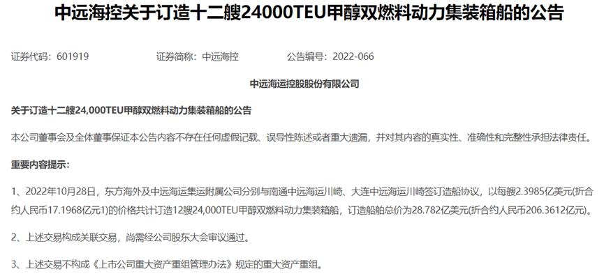 同日,中远海控还发了另一则公告称,将以每艘2.4亿美元(折合约人民币17.2亿元)的价格共计订造12艘集装箱船,订造船舶总价为28.78亿美元(折合约人民币206.36亿元)。