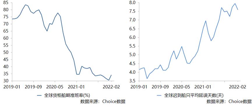 Choice数据显示,全球货柜船期准班率在2022年1月低至30.4%,疫情前的2019年,该数据曾高达83.4%;全球迟到船只平均延误天数在2022年1月飙升至7.95天,在2019年,该数据最低只有3.63天。