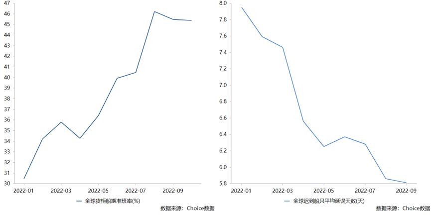 Choice数据显示,2022年全球货柜船期准班率由年初的30.4%提高至下半年的46.2%;全球迟到船只平均延误天数由年初的7.95天下降至下半年的5.81天。