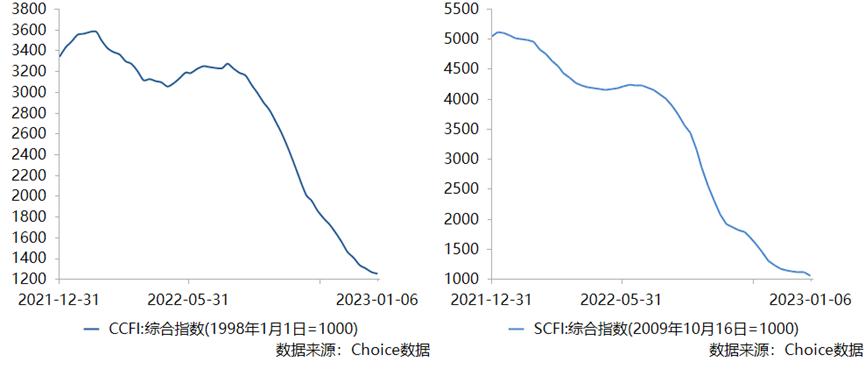 截至2023年1月6日,CCFI报1255.89点,SCFI报1061.14点,相比2022年年初, 分别暴跌了65%和79% 。