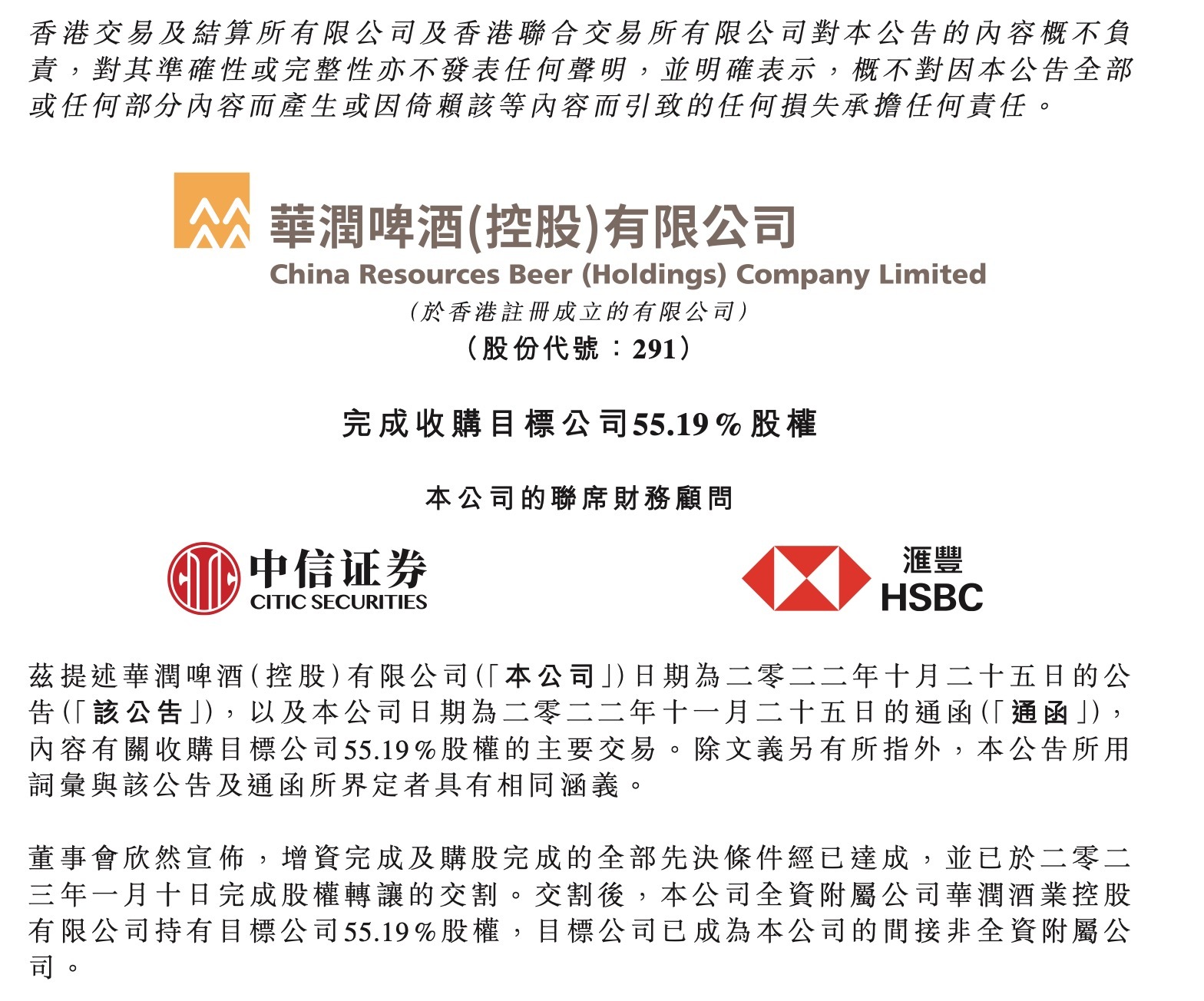 1月11日,华润啤酒发布公告称,金沙酒业增资完成及购股完成的全部先决条件已经达成,并已于完成股权转让的交割。交割后,华润啤酒全资附属公司华润酒业控股有限公司持有金沙酒业55.19%股权,后者成为华润啤酒的间接非全资附属公司。