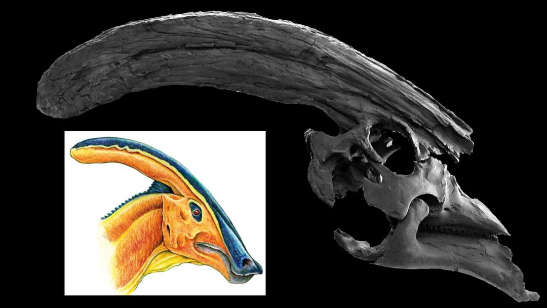 1995年,墨西哥自然历史与科学博物馆的古生物学家们挖掘出了副栉龙一个几乎完整的头骨。通过CT扫描仪,他们拍摄了350张前所未有富含细节的图像,并用数字模型重建了头骨。
