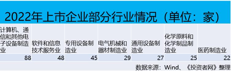 从2022年上市企业的行业来看,制造业无疑是重头戏,2022年上市的428家企业中,商业、文化、公共服务等行业的企业合计仅有数十家。在卡脖子的计算机、通信和其他电子设备制造业等半导体行业,2022年有88家企业完成了首发,在全年首发企业数中的占比为20.56%。
