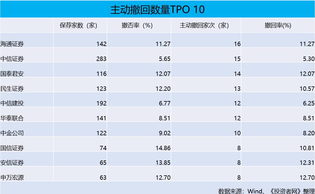 中德证券、申港证券、国都证券等中小券商,难以拿到优质项目,在保荐业务上更是全军覆没;而中天国富虽然仅保荐了10个项目,却有3个项目被否,2个项目主动撤回,撤否率达到50%;公司及旗下的保荐人方蔚、赵亮也因在保荐浙江鑫甬生物化工股份有限公司项目时未能勤勉尽职而收到了监管层的警示函。据统计,撤否率超过50%以上的保荐机构就有10家,这也侧面反映了首发标准的提高,实力不够的企业难以侥幸通关。