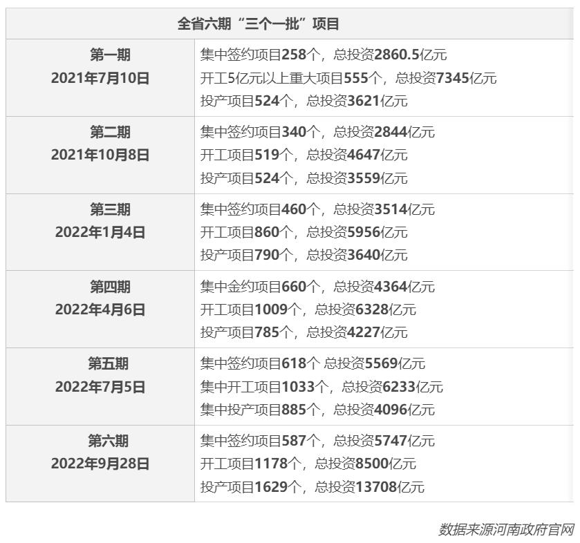 自2021年7月,我省以每个季度一次的频率滚动举行“三个一批”活动。各省辖市、济源示范区、航空港区和各县(市、区)同步举行“三个一批”项目建设活动。