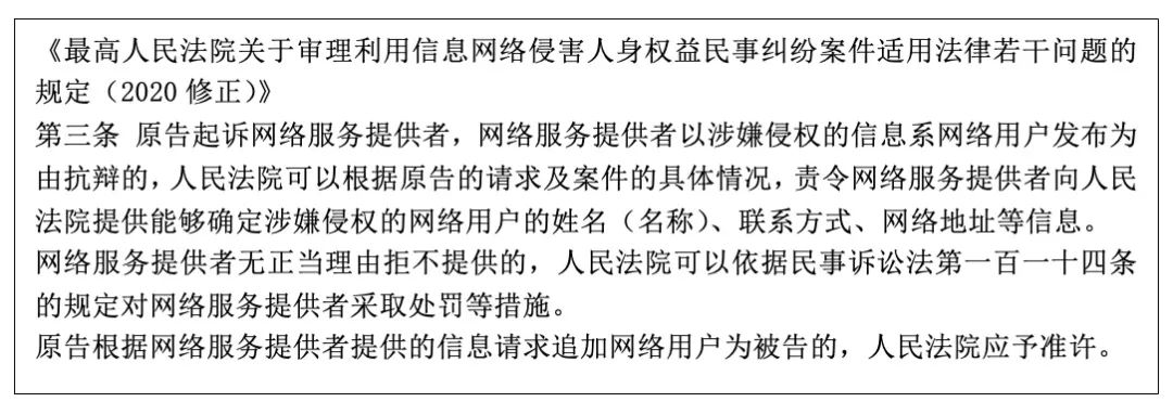 实践中,通常的操作是先起诉涉案的网络平台,要求平台向原告披露涉侵权主体的真实用户信息,一般平台在这一诉讼过程中即会提供相关信息,原告再根据平台提供的信息调取涉侵权行为用户的身份信息,追加其为被告或再行提起名誉权侵权之诉。至此,才正式进入了是否侵权的正式审理阶段。在起诉涉侵权用户时,如相关微博/言论已经删除的,也有原告会选择将平台列为共同被告,要求平台披露相关微博/言论的浏览量、评论量等数据,以便于判断涉案言论的影响大小【例如(2022)京0491民初10124号、(2021)京04民终436号】。同样地,如果平台经原告主张而未能及时对相关侵权内容采取措施导致侵权范围扩大的,也会有原告一并将平台列为共同被告、要求平台承担相应责任【例如(2021)京0491民初17952号】。