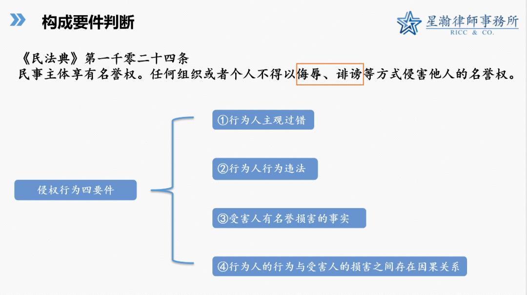 司法实践中,名誉权侵权行为的表现形式往往是当事人进行了“侮辱”“诽谤”行为,导致受侵害方社会评价降低、人格受辱。其中,侮辱是指当事人在发表言论、进行意见表达时,以暴力或其他方式贬损他人人格,毁损他人名誉。而诽谤聚焦在当事人进行事实描述时,是否存在捏造、虚构不实信息或散布虚假信息的行为。