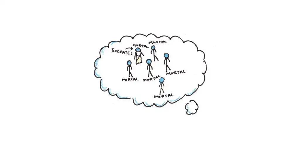 检验像“所有人都会死”这样的三段论。苏格拉底是人。因此,“苏格拉底会死”,我们想象一群人,他们都会死,并想象苏格拉底是其中之一。我们通过这个检验推导出三段论是真的。