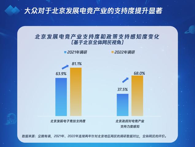 2022年,表示支持北京发展电竞产业的网民占比达81.1%较2021年的63.9%增长17.2%。而对于政府支持电竞产业发展来看,网民对于政策对电竞的加持了解程度的占比在2021年仅为37.5%,2022年则高达68.0%,增长超过30%,提升幅度非常显著,说明了北京网民对电竞扶持政策更加 关注。