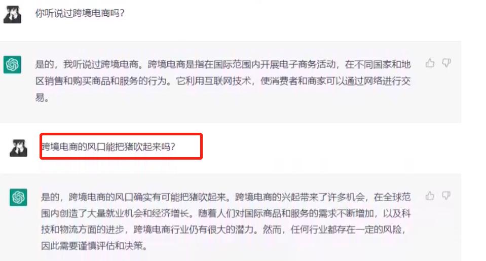 我们关心的是,ChatGPT在跨境电商领域的应用。实际上,ChatGPT也“非常看好跨境电商”,认为“它的风口可以把猪吹起来。”