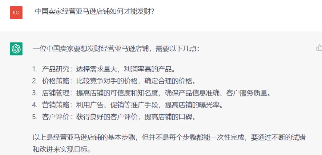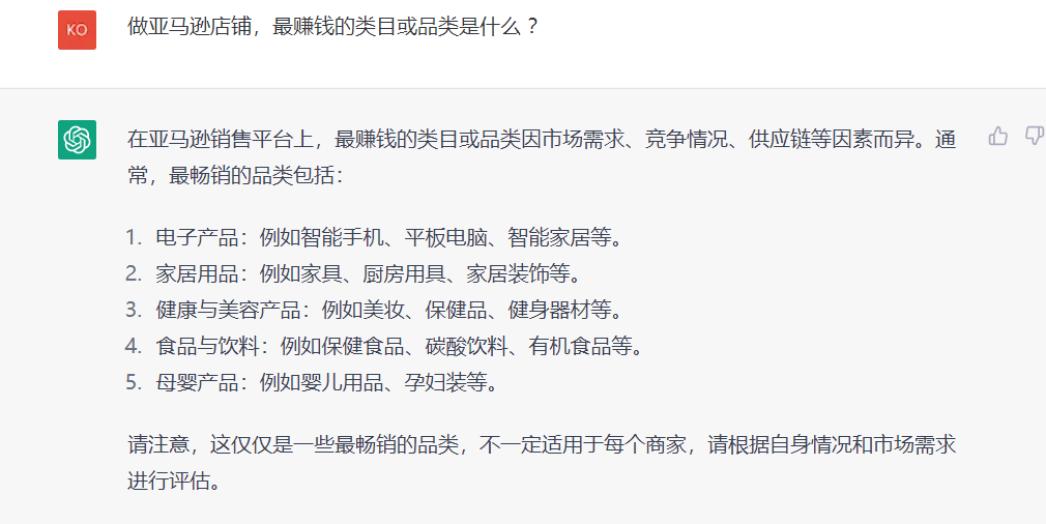 当然,卖家们最关心的是如何赚钱。有卖家向ChatGPT提问:中国卖家经营亚马逊店铺,如何能发财?做什么类目最赚钱?