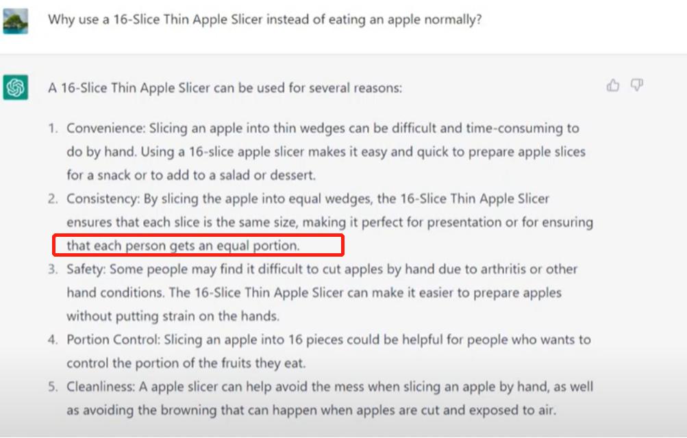 比如,我们卖一款水果切割器,ChatGPT可以非常体贴了写出了“可以让每个吃苹果的人分到相等的一块”。