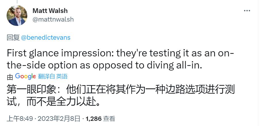 虽然还没有用上新版 Bing,但是从这次新版本上线速度之快,以及一些使用后的用户的反馈来看,Bing 这一次发布会的首要目的就是抢在谷歌之前发布新品,占领市场先机吸引一波用户注意力,至于产品的细节可以之后在慢慢打磨,毕竟这对于一直在搜索上落后的微软太具诱惑。