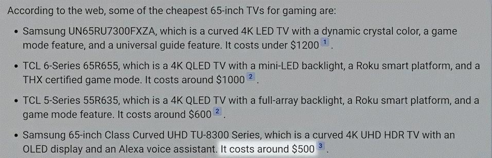 在 Reddit 上,有一位细心的网友发现,在微软的发布会上的展示过程中,当查询 65 英寸电视的价格时,有一款三星的电视的价格标错了。对此,有网友认为,这很有可能是因为 AI 在搜集信息的时候混淆了电视的官方标价和它在其他网站上展示的二手价。