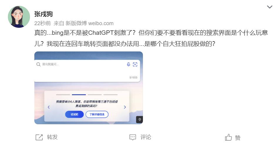 国内的社交媒体上,也有网友发表了同样的观点,“我以为微软会把 ChatGPT 的技术用到搜索引擎的算法上呢,没想到就加了一个新的 tab?”
