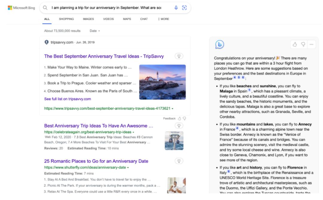 这里引用硅星人的一张图,当输入“我计划在 9 月份来一场毕业旅行”的时候,Bing 不仅根据各种喜好列出了目的地选择(比如喜欢沙滩建议去马拉加、喜欢人文建议去佛罗伦萨等),还在答案开头送上一句“恭喜毕业”的祝福语,像是朋友间的对话。