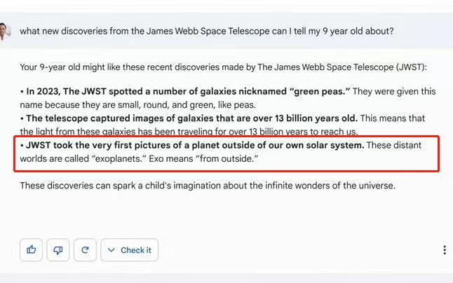 而尴尬的是,这边刚说要保证 Bard 的信息质量,但在发布会上,Bard 就对“我可以告诉我 9 岁的孩子关于詹姆斯·韦伯太空望远镜的哪些新发现?”问题,给出了错误的答案。