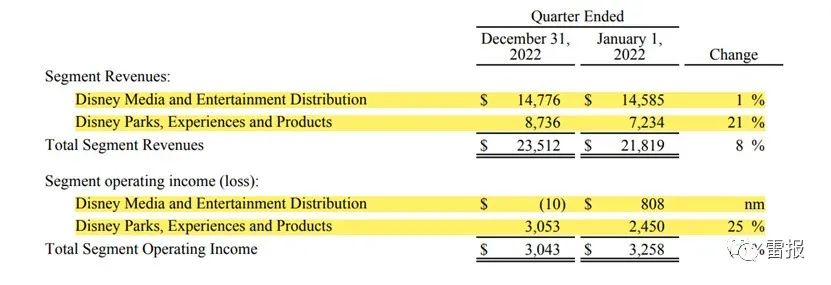 目前,迪士尼旗下业务主要分为“媒体与娱乐发行”以及“乐园、体验与产品”两大部分。总体来看,“媒体与娱乐发行”部门于该季度实现营收147.76亿美元,同比增长1%;经营亏损达1000万美元。“乐园、体验和产品”部门该季度营收87.36亿美元,同比增长21%;经营利润30.5亿美元,同比增长25%;