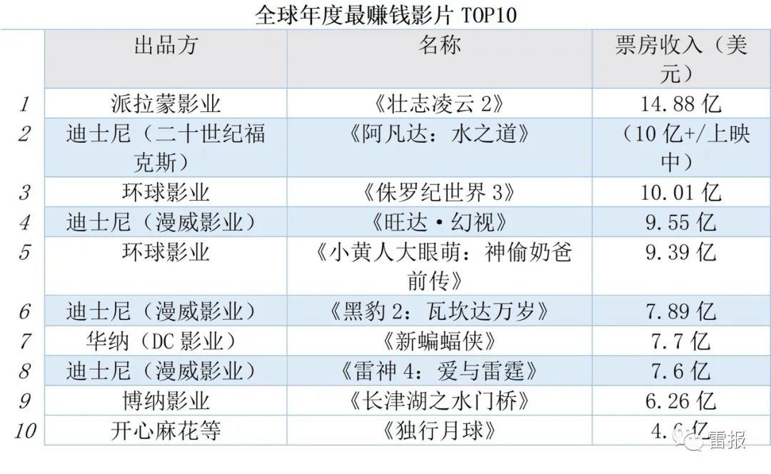 2022年迪士尼全球票房收入高达49亿美元,全球最赚钱电影榜单TOP10中上榜四部