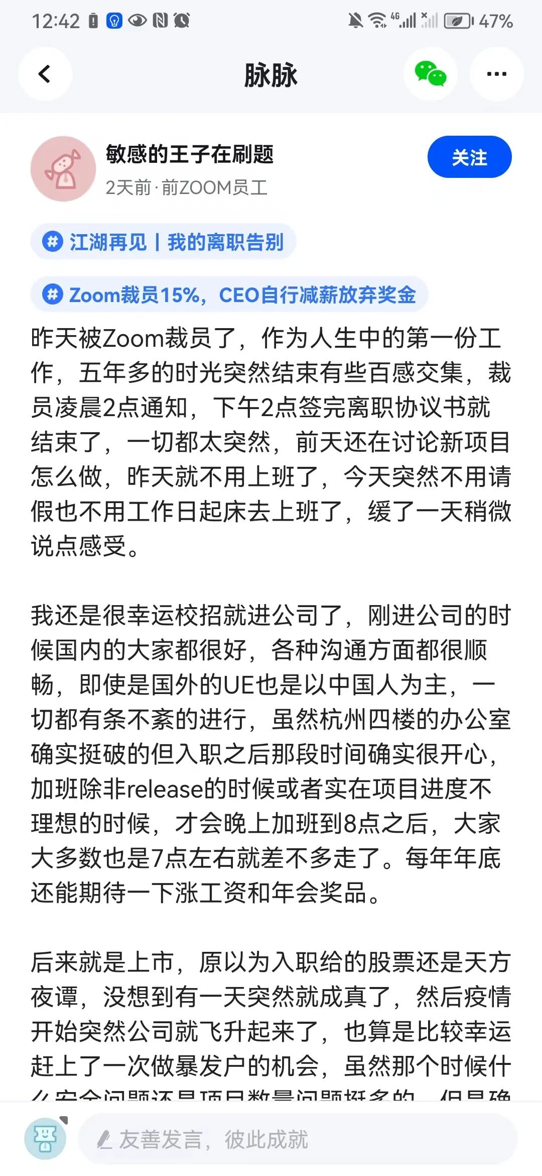 尽管Zoom给予的裁员补偿较为丰厚,但对于大多数员工来说这次裁员来的太突然。