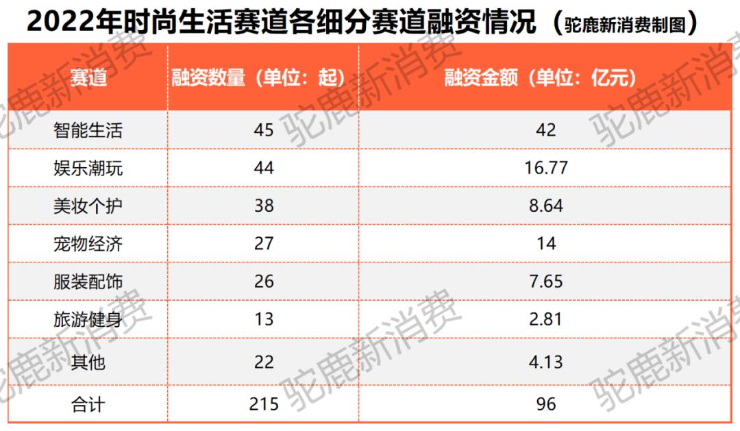 根据驼鹿新消费不完全统计,2022年全年,国内时尚生活赛道共发生215事件,根据已披露融资金额的企业估算,总计获得了超过96亿元的融资。