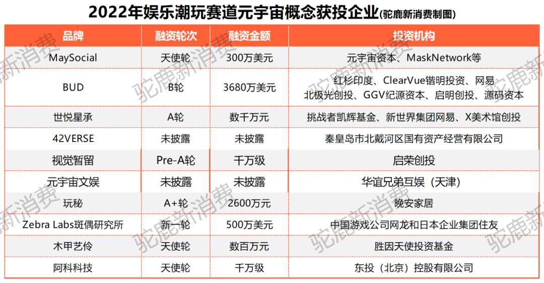 从融资数量上看,娱乐潮玩赛道在2022年依然比较受资本欢迎。娱乐潮玩赛道主要有元宇宙娱乐、VR游戏、手办潮玩等众多玩家。2022年是元宇宙概念爆发的一年,元宇宙相关概念的娱乐潮玩公司融资较多,有多达10家相关企业获得融资。