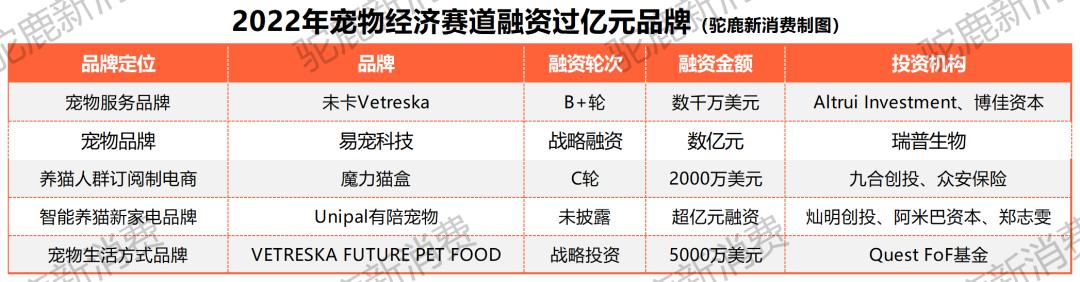 2022年下半年,宠物经济赛道开始爆发。根据驼鹿新消费不完全统计,2022年全年,国内宠物经济赛道共发生27起融资事件,根据已披露融资金额的企业估算,总计获得了超过14亿元的融资。