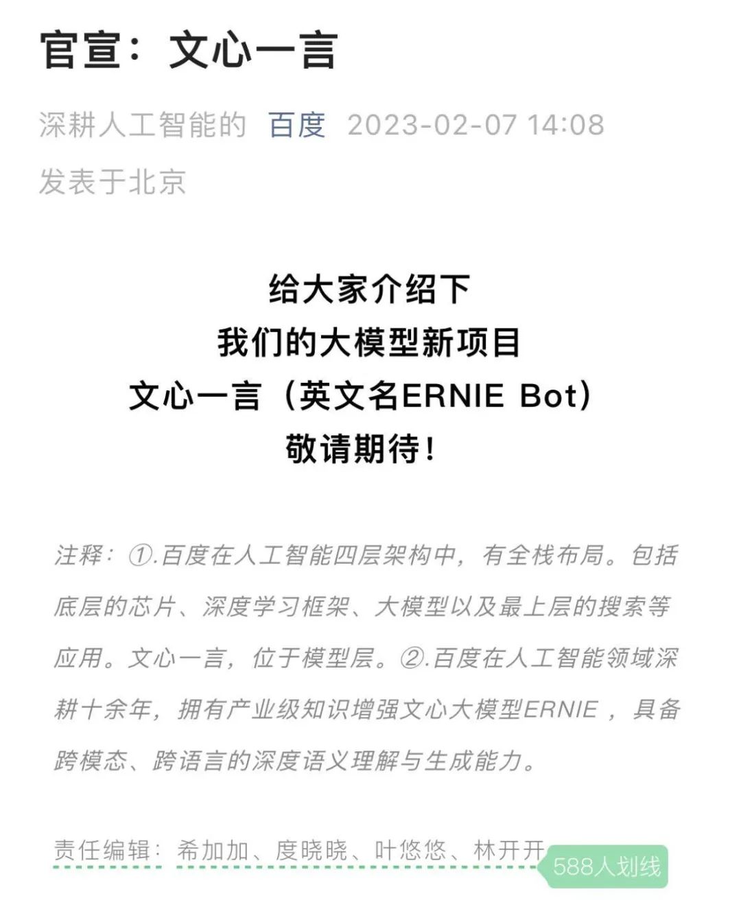 在国内众多科技大厂中,百度是最早针对 ChatGPT 做出明确表态的公司之一。2 月 7 日,百度正式官宣将在 3 月上线百度版 ChatGPT——「文心一言」(英文名为 ERNIE Bot)。