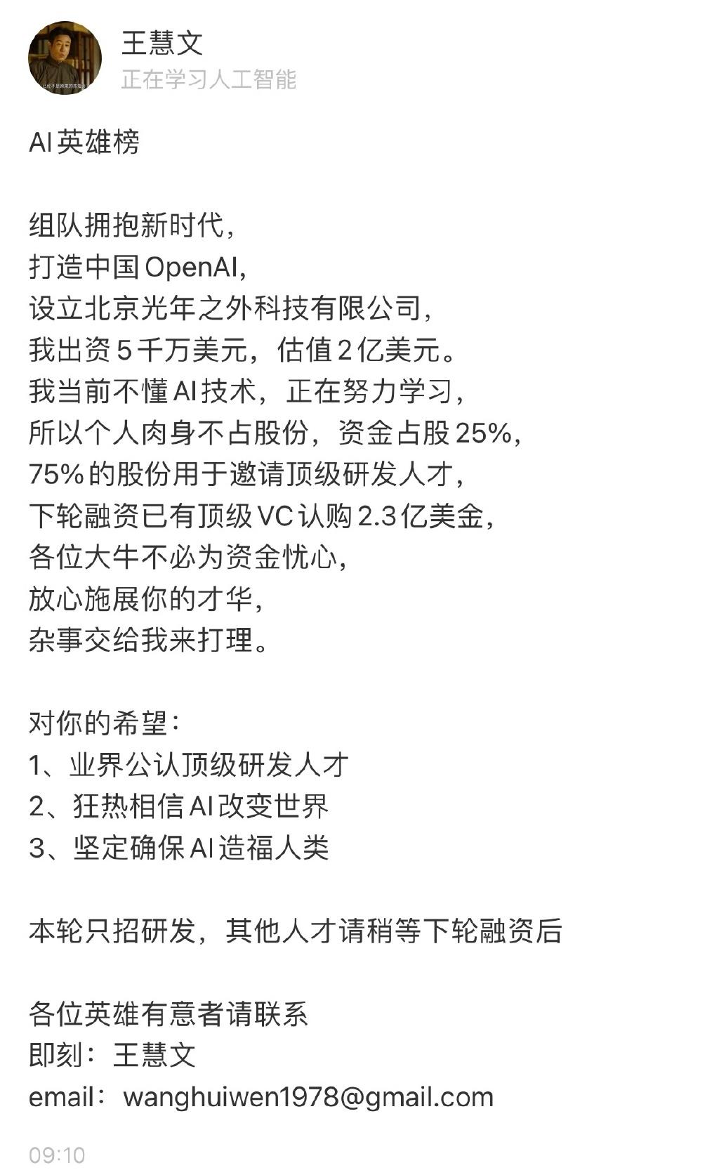 近日,美团联合创始人王慧文在朋友圈高调发声,表示愿意带资 5000 万美元(约合人民币 3.4 亿元)入组并进军人工智能,以打造中国版 OpenAI 和 ChatGPT。