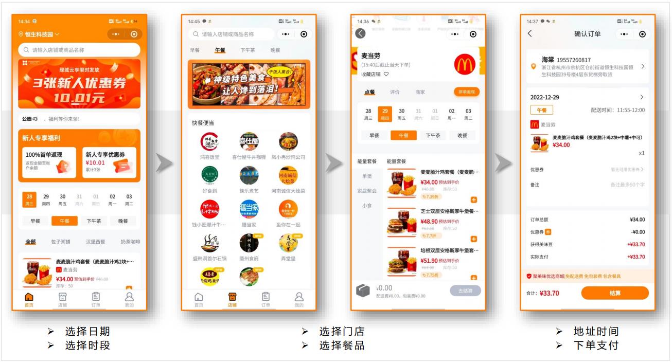 - 在消费者侧,消费者可以在“聚美味”小程序提前1-5天预订当周早、午、晚餐与下午茶,并可享受免配送费、免包装费等服务,加之平台让渡了部分与商家侧的利润分成,因此消费者在选择同一门店同一菜品时,预订餐形式的客单价往往低于外卖客单价。