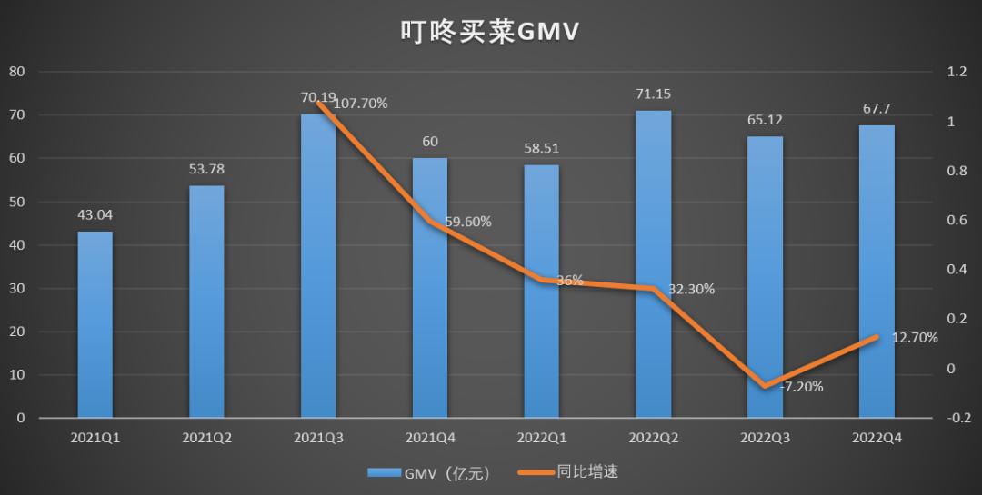 2022年第四季度,叮咚买菜的GMV达67.695亿元,虽然同比增长12.7%,但环比仅增长约4%,并且增速远不及2021年。