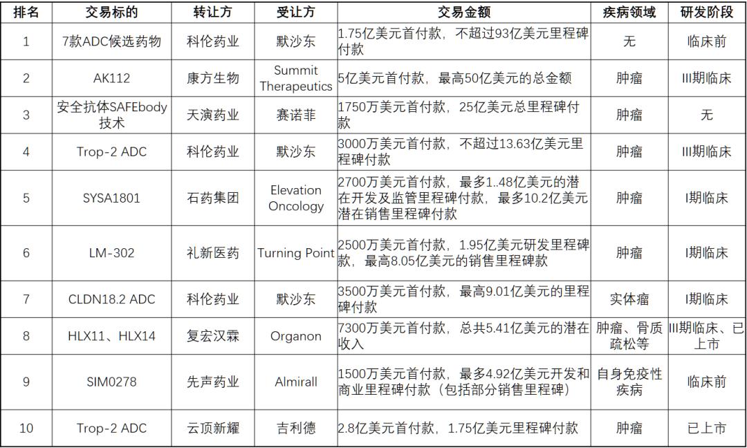 ▲2022年我国创新药License out交易TOP10 数据来源:康橙投资、公开信息