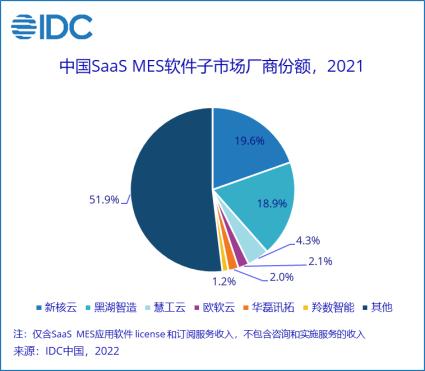 根据IDC发布的《制造业MES市场分析及厂商份额(2021)》,2021年,中国制造业MES市场份额为38.1亿元,年增长率为23.3%。未来两年,MES仍然是制造企业最优先投资的工业基础软件之一。此外,MES市场高度分散,各细分行业存在一定差异性,而新核云选择集中突破的细分领域,则是汽车行业。IDC发布的报告中也能看到,新核云除SaaS MES取得最高的市场份额外,在整车及零部件、装备制造两个细分行业,同样获得了第一名。