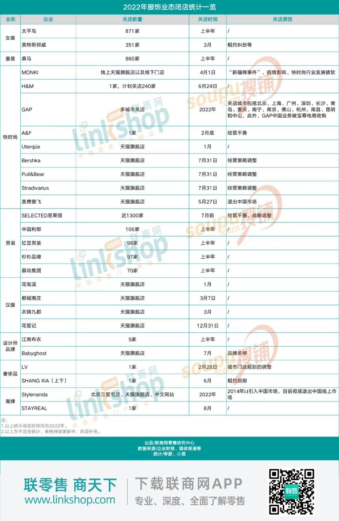 从2002年进入中国后开始一路疾驰的快时尚品牌在近两年被按下了紧急暂停键,令人扼腕。《联商网》统计发现,快时尚品类是关店“重灾区”,2022年20家发文告别退出的企业中,快时尚企业就有10家,占总数的一半。