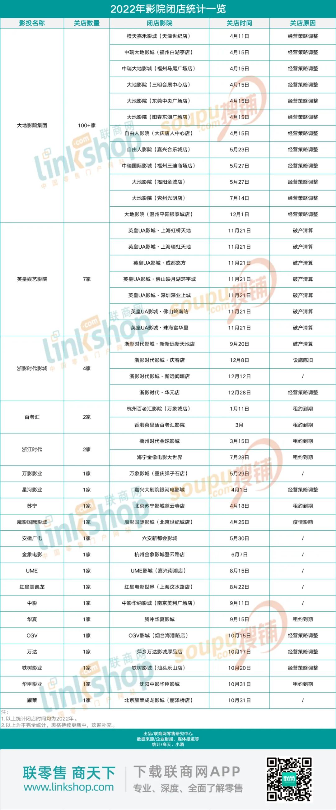 从2019年开始,大地影院多次涉嫌纠纷案件,案由基本是房屋租赁合同纠纷、买卖合同纠纷、劳动合同纠纷等。据企查查数据,2022年大地影院的涉案信息达到61起,目前涉案数量153起,公司法人、董事长被限制消费令,公司被执行总额超1.5亿元。受此影响,大地影院在2022年迎来了关店潮。除了大地影院,出现大面积关停的还有英皇UA电影城。此外,百老汇、浙江时代、浙影时代影城等影投均关停了至少两家以上的影院。
