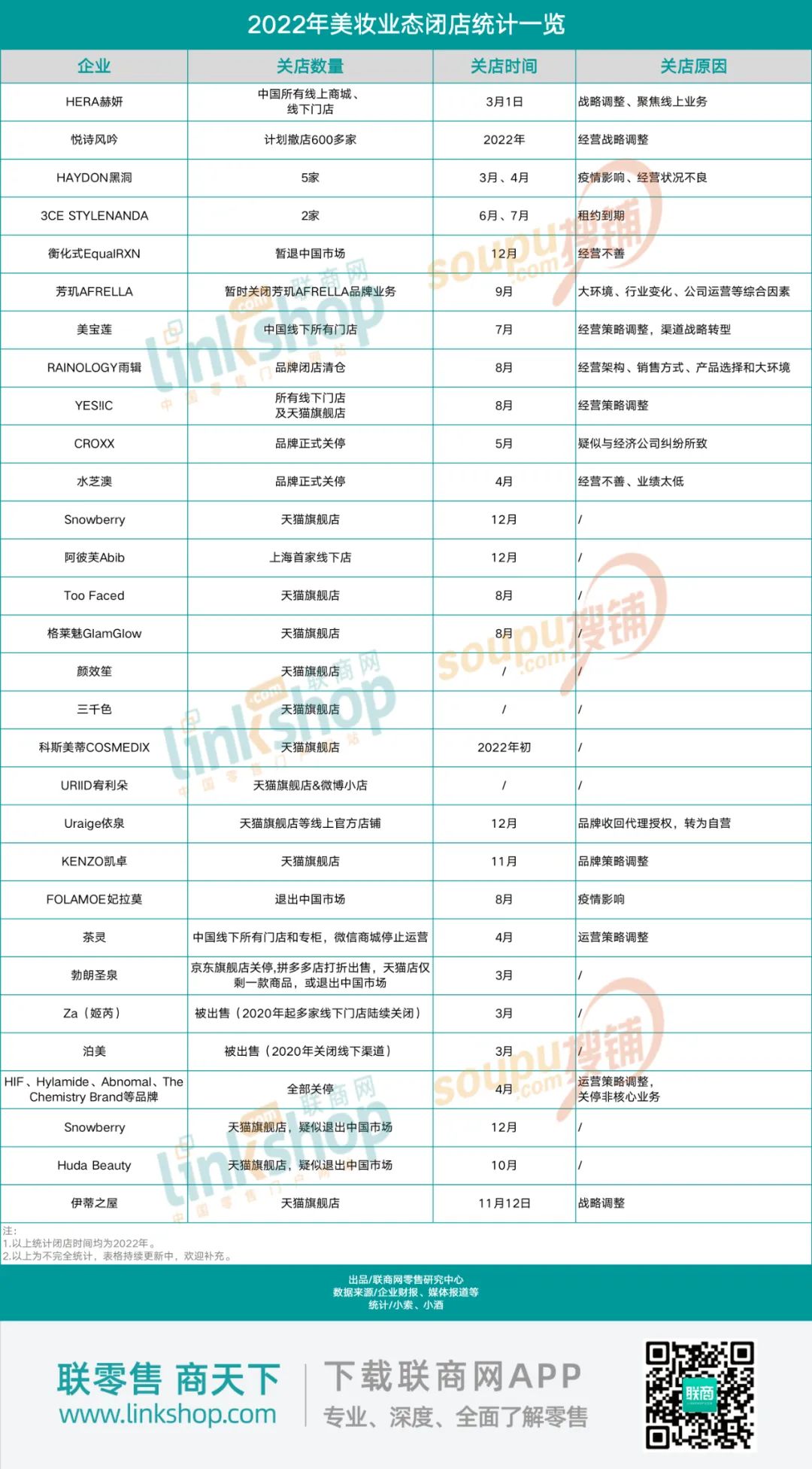 据联商网零售研究中心不完全统计,2022年美妆业态至少有31家品牌、600多家店关闭。在这其中,有不少品牌是由于退市而闭店,关闭的品牌中既包括外国品牌退出中国市场,也有本土品牌正式关停。