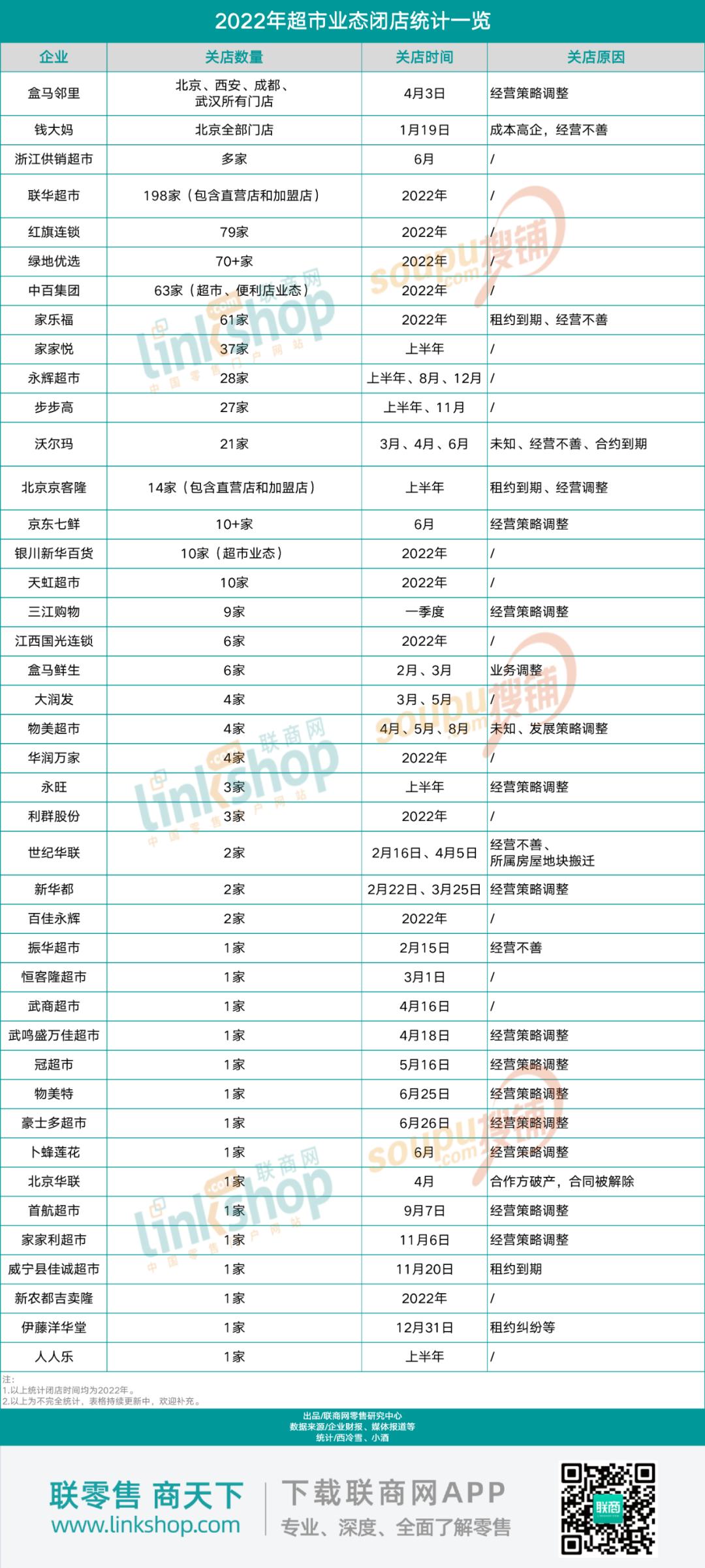 据联商网零售研究中心不完全统计,2022年共有34家知名超市企业、超680家门店关闭。其中包括联华超市关闭198家,红旗连锁超市关闭79家,绿地优选关闭70多家,中百集团关闭63家(超市、便利店业态)等。
