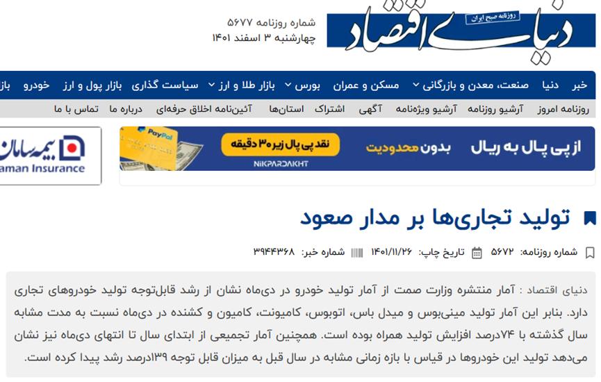 伊朗经济日报(Donya-e-Eqtesad)介绍伊朗2023年一月的汽车生产数据