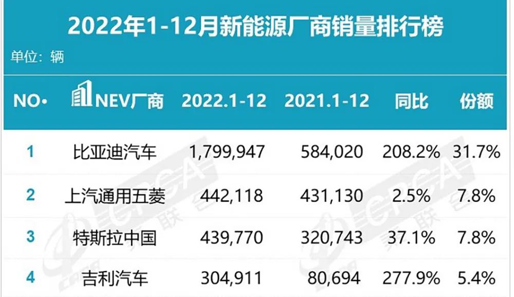 回顾2022年全年新能源厂商销量,可以看到前三名被比亚迪、上汽通用、特斯拉占领。比亚迪销量具有压倒性优势,上汽通用五菱凭借爆款电动车宏光MINI取得亚军。特斯拉中国凭借超高毛利率领跑中高端纯电市场,销量接近44万。
