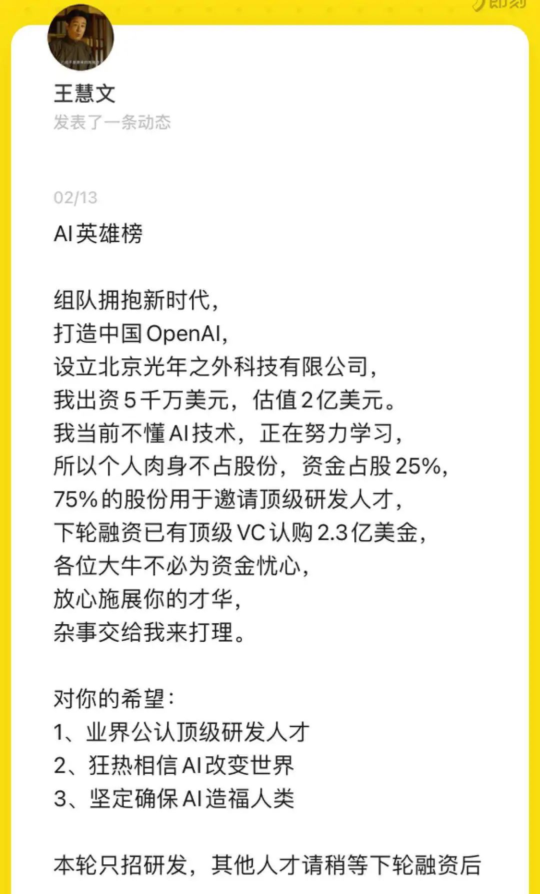 创业的方向已经很明了。做中国版对标ChatGPT的大模型,是显而易见的一条路。目前百度的“文心一言”已经呼之欲出,原美团联合创始人王慧文也宣布携5000万美元进军AI,要打造中国的OpenAI(ChatGPT的研发公司)。